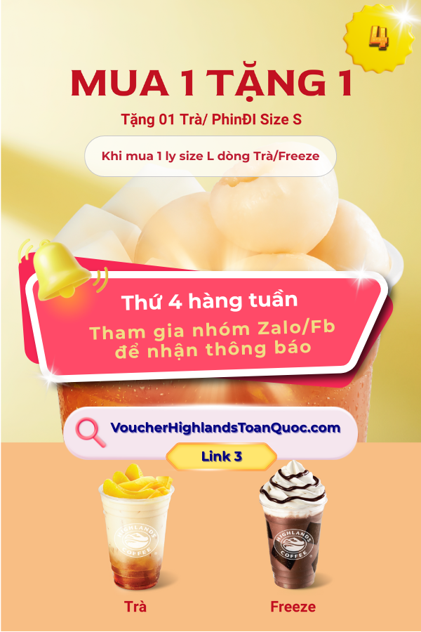 - Voucher Highland Coffee MUA 1 Tặng 1 thường lên ngẫu nhiên thứ 2 và thứ 3 hàng tuần với số lượng có hạn. Nếu không tìm thấy hãy vào Group Facebook Voucher Highland Toàn Quốc tìm ADMIN Đào Thành Đạt nhận khuyến mãi highland miễn phí.